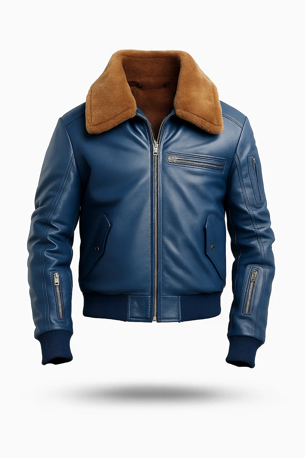 Blue Flight Bomber Shearling Fur Style Collar Leather Jacket