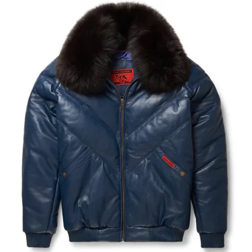 Discover the stylish Navy Leather V-Bomber Jacket at Jacketars. Shop our exclusive collection of premium leather jackets for men and women today!