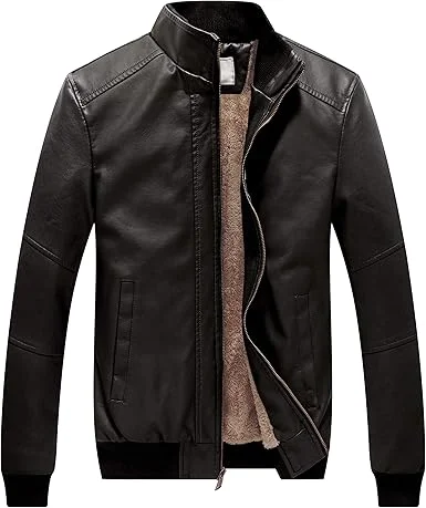 WenVen Classic Stand Collar Grey Fleece Bomber Leather Jacket